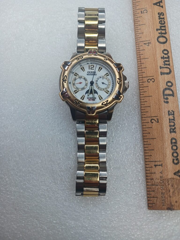 Offered here is a vintage Guess Waterpro men’s wristwatch from 1997, featuring reliable Japanese quartz movement and 50-meter water resistance. This classic timepiece combines sporty functionality with iconic 90s style, making it a great addition for watch collectors or vintage fashion enthusiasts.